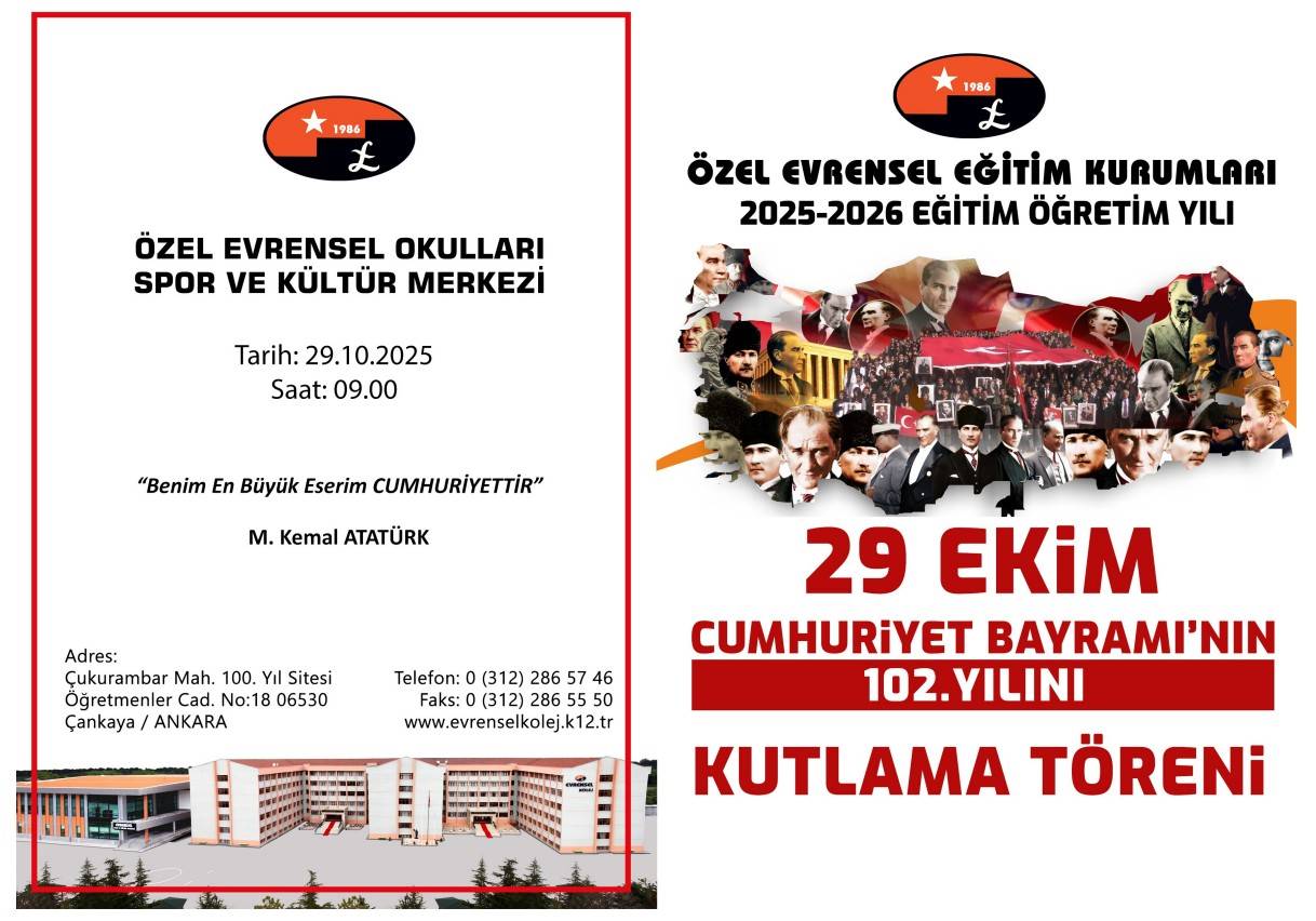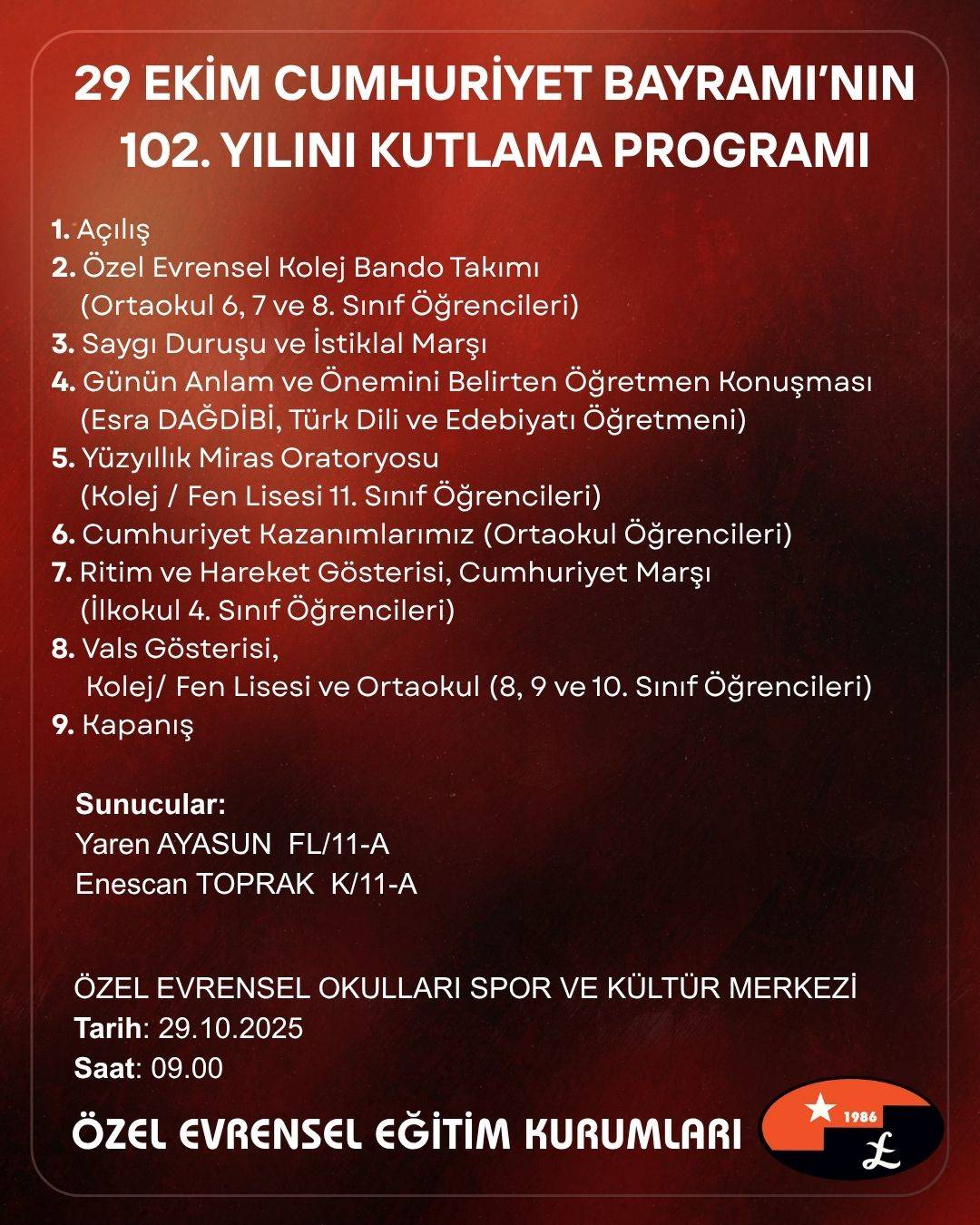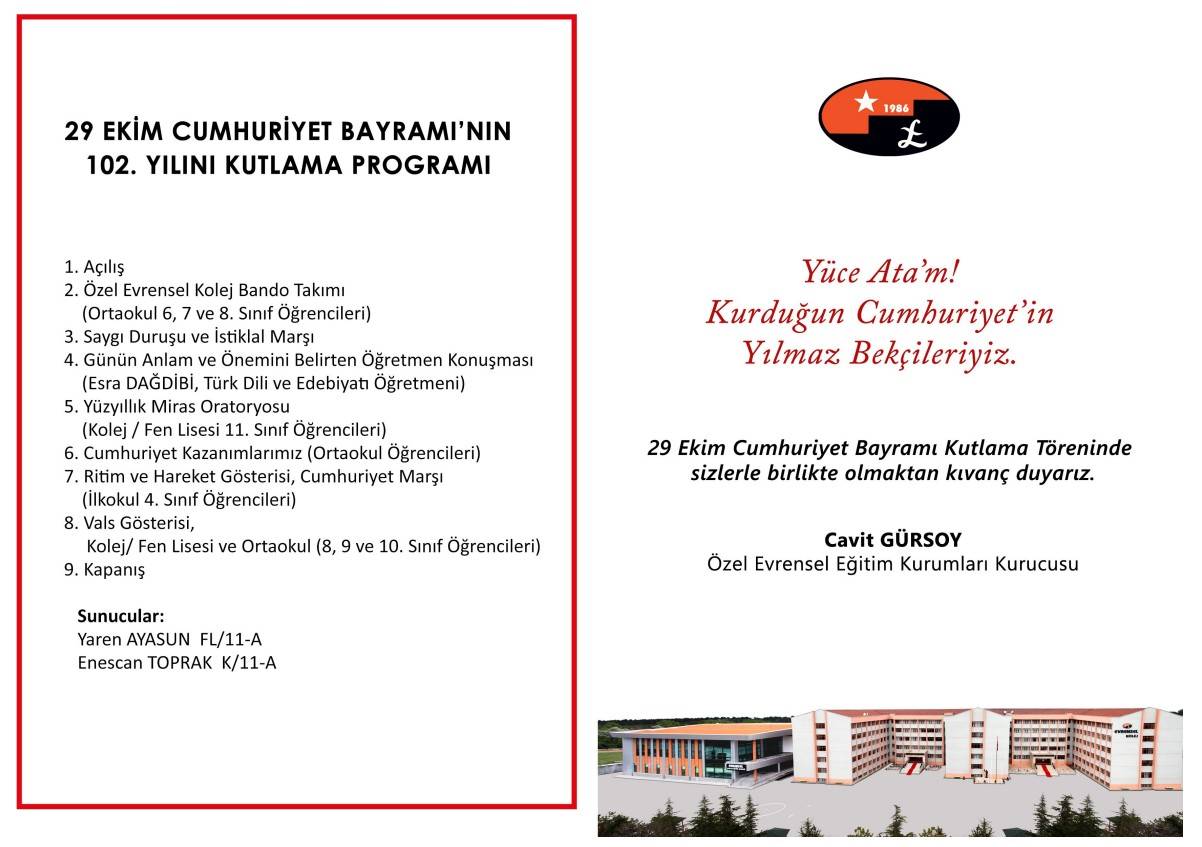 28 Eki 2025 29 EKİM CUMHURİYET BAYRAMIMIZI KUTLAMA TÖRENİNE DAVETLİSİNİZ Türkiye Cumhuriyeti’nin Kuruluşunun 102. Yıl Dönümünü Kutladığımız 29 Ekim Cumhuriyet Bayramı Kutlama Programında Sizleri Aramızda Görmekten Mutluluk Duyarız. Paylaş: