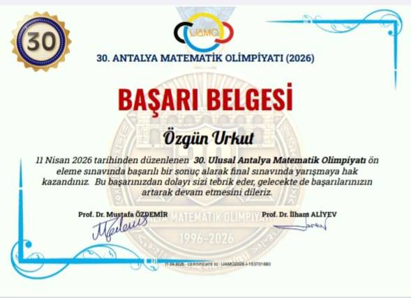 Matematik dünyasının en prestijli organizasyonlarından biri olan ve bu yıl 30'uncusu düzenlenen Ulusal Antalya Matematik Olimpiyatı'ndan (UAMO) okulumuza gurur verici bir haber geldi.