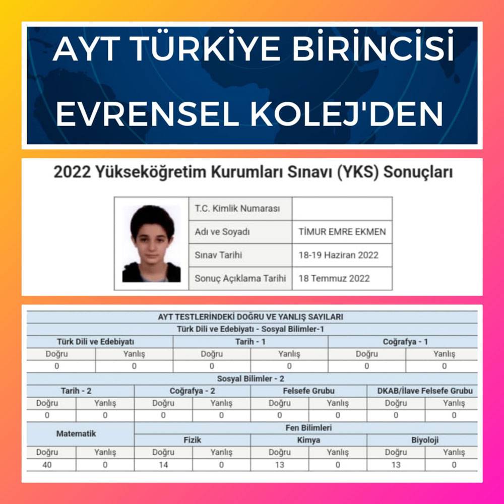 AYT Sayısal sorularının tamamını doğru yapan Özel Evrensel Kolej öğrencisi Timur Emre EKMEN, AYT 2022 TÜRKİYE BİRİNCİSİ.