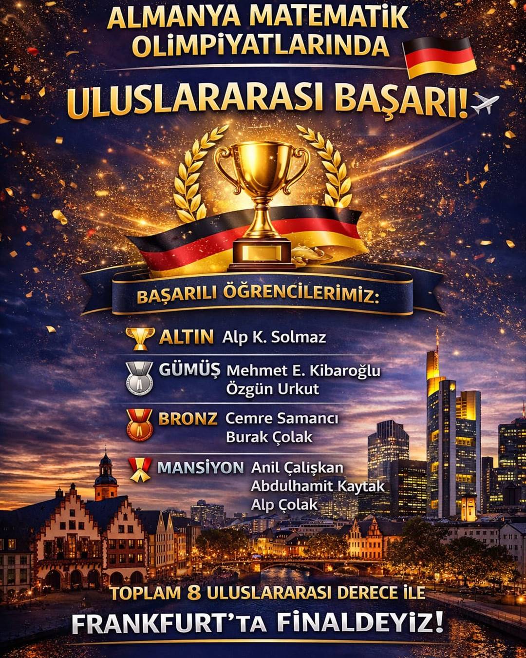Evrensel Kolej öğrencileri, Almanya merkezli German Math International Final Yarışması’nda elde ettikleri toplam 8 derece ile önemli bir uluslararası başarıya imza attı. Yarışmada öğrencilerimiz 1 Altın Madalya, 2 Gümüş Madalya, 2 Bronz Madalya ve 3 Mansiyon Ödülü kazanarak okulumuzu başarıyla temsil etti.