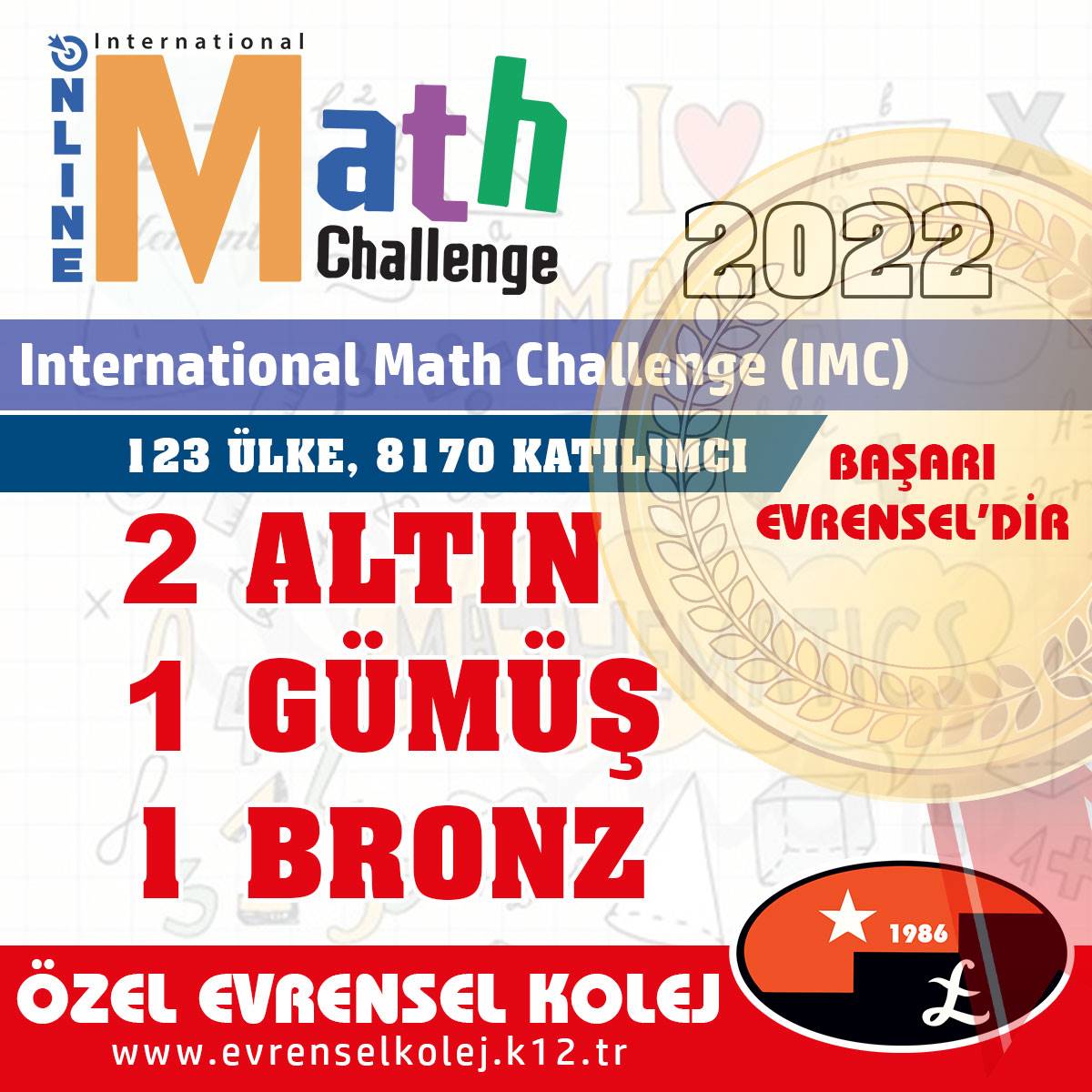 Dünyada önde gelen matematik tabanlı yarışmalardan biri olan Uluslararası Matematik Yarışması (IMC), geçen yıl, 96 ülkeden 5000'den fazla öğrencinin katılımıyla gerçekleşti. Bu yıl ise 123 ülke ve yaklaşık 8170 öğrencinin katılımıyla gerçekleşen yarışmada EVRENSEL KOLEJ öğrencileri 2 ALTIN, 1 GÜMÜŞ, 1 BRONZ MADALYA kazanarak büyük bir başarıya imza attılar. Madalya kazanan öğrencilerimiz ayrıca Türkiye’den katılan öğrencilerin arasından en yüksek puanı alarak TÜRKİYE BİRİNCİSİ oldular.