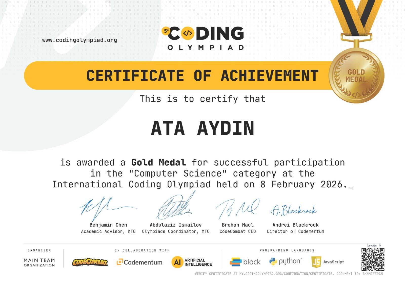 Öğrencimiz ATA AYDIN, 8 Şubat 2026 tarihinde düzenlenen International Coding Olympiad’da Bilgisayar Bilimleri kategorisinde gösterdiği üstün performansla ALTIN MADALYA kazanarak uluslararası arenada önemli bir başarıya imza attı. Zorlu rakipler arasından sıyrılarak zirveye ulaşan öğrencimiz, analitik düşünme gücü, ileri düzey problem çözme becerisi ve kararlılığıyla geleceğin teknoloji dünyasında söz sahibi olacağını bir kez daha kanıtladı.