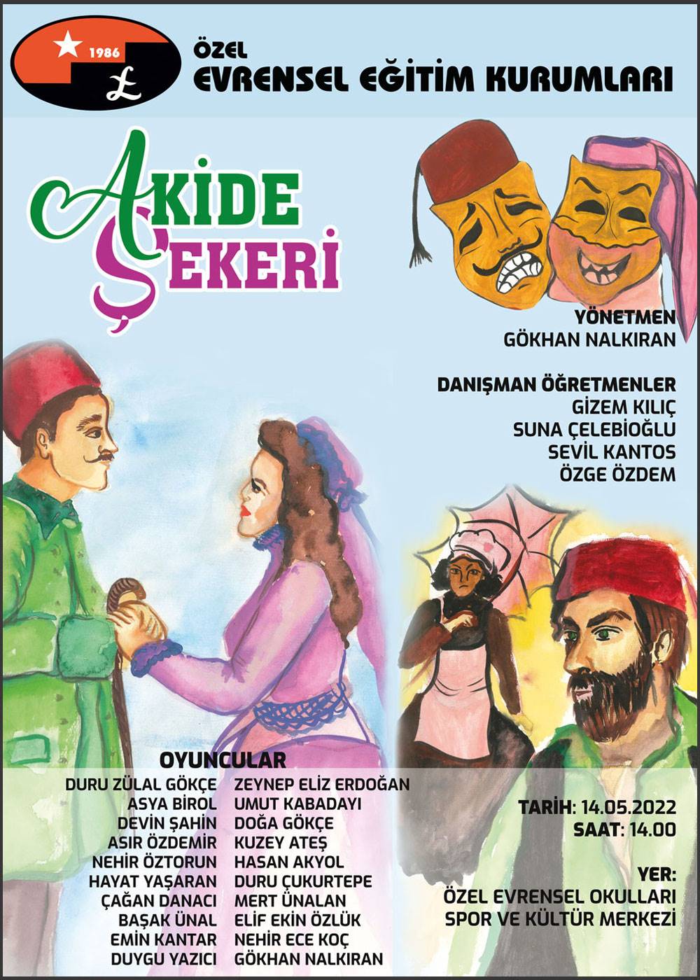 Özel Evrensel Okulları Spor ve Kültür Merkezinde "Akide Şekeri" adlı tiyatro oyunu öğrenci, öğretmen ve velilerimize başarıyla sergilendi. Oyun izleyicilerden büyük beğeni topladı.