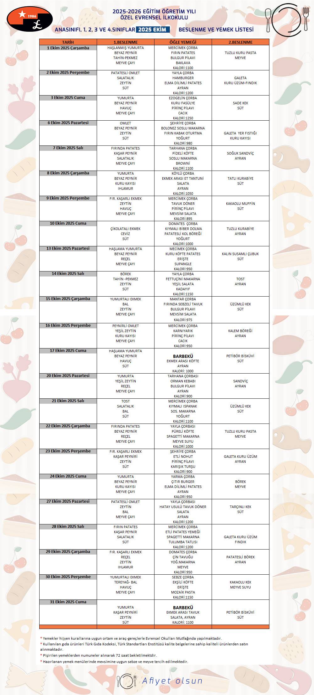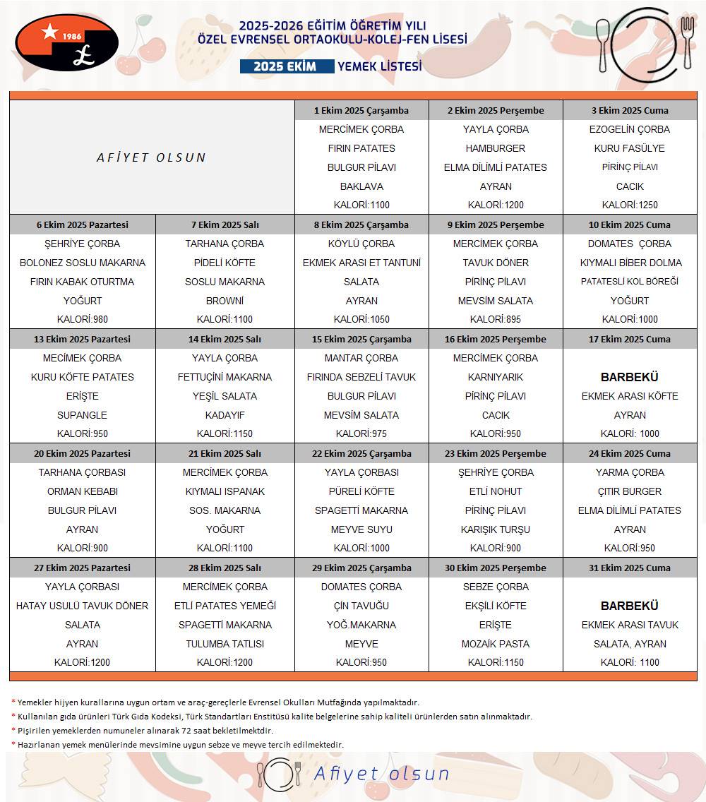 ÖZEL EVRENSEL OKULLARI EKİM 2025 YEMEK LİSTESİ