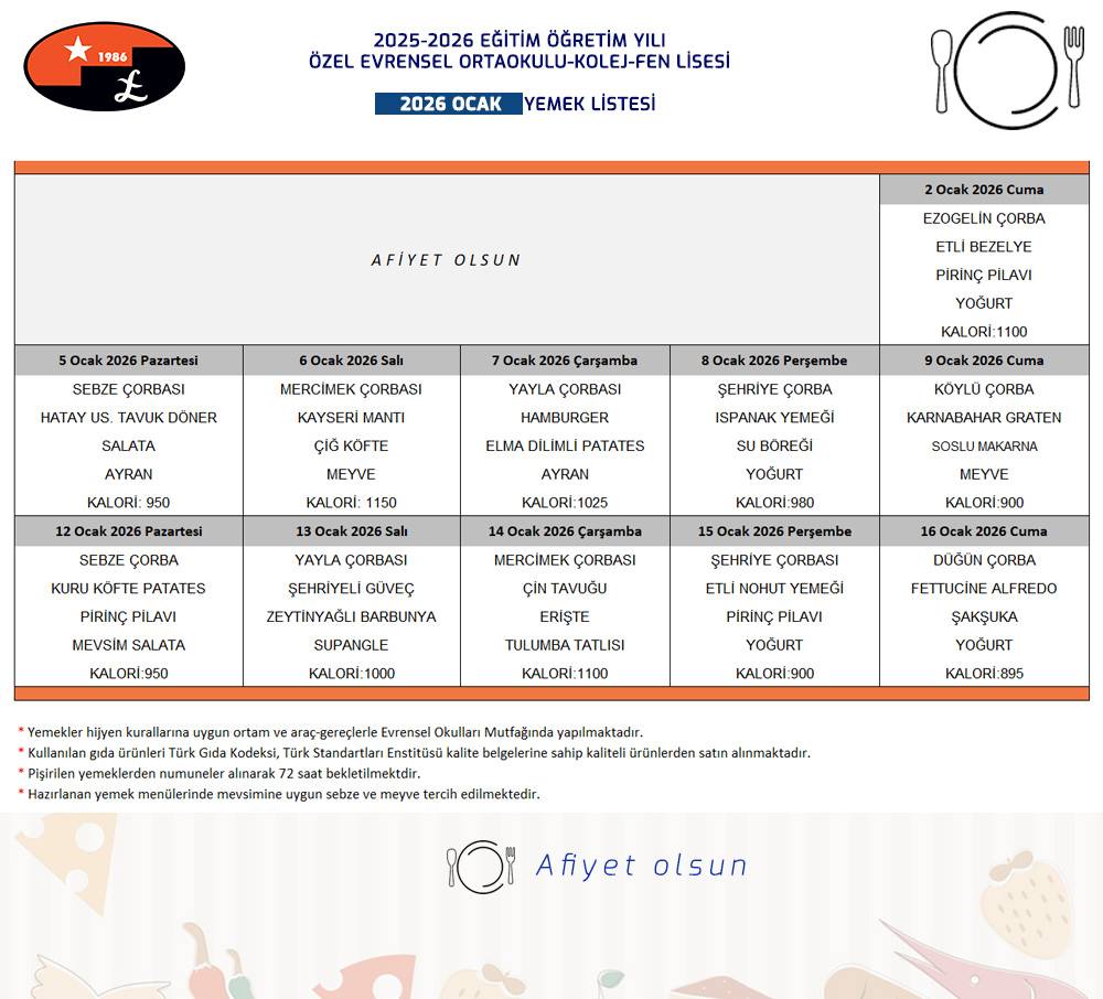 ÖZEL EVRENSEL OKULLARI OCAK 2026 YEMEK LİSTESİ