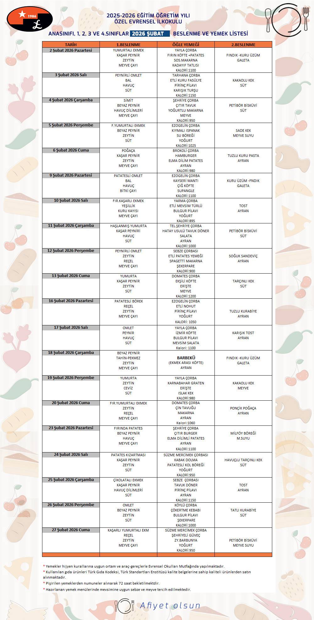ÖZEL EVRENSEL OKULLARI ŞUBAT 2026 YEMEK LİSTESİ