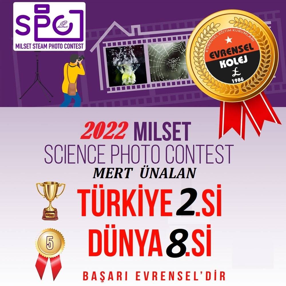 “When Arts Meet Science” sloganıyla 2007’den günümüze düzenlenen MILSET organizasyonunun Belçika merkezi tarafından gerçekleştirilen, dünyanın en önemli fotoğraf yarışmalarından biri olarak gösterilen MILSET Bilim Fotoğraf Yarışması’na (MILSET Science Photo Contest) EVRENSEL KOLEJ öğrencisi MERT ÜNALAN, bu sene 16.sı düzenlenen profesyonel fotoğrafçıların ve bilim insanlarının desteği ile yürütülen ve birçok ülkeden yüzlerce fotoğrafın gönderildiği bu prestijli organizasyonda dünyanın en iyi 10 fotoğrafı arasına girerek bizlere büyük bir gurur yaşattı. Ayrıca MILSET SPC Gallery'de yayınlanan fotoğraf ESI 2023’ün bir parçası oldu.
