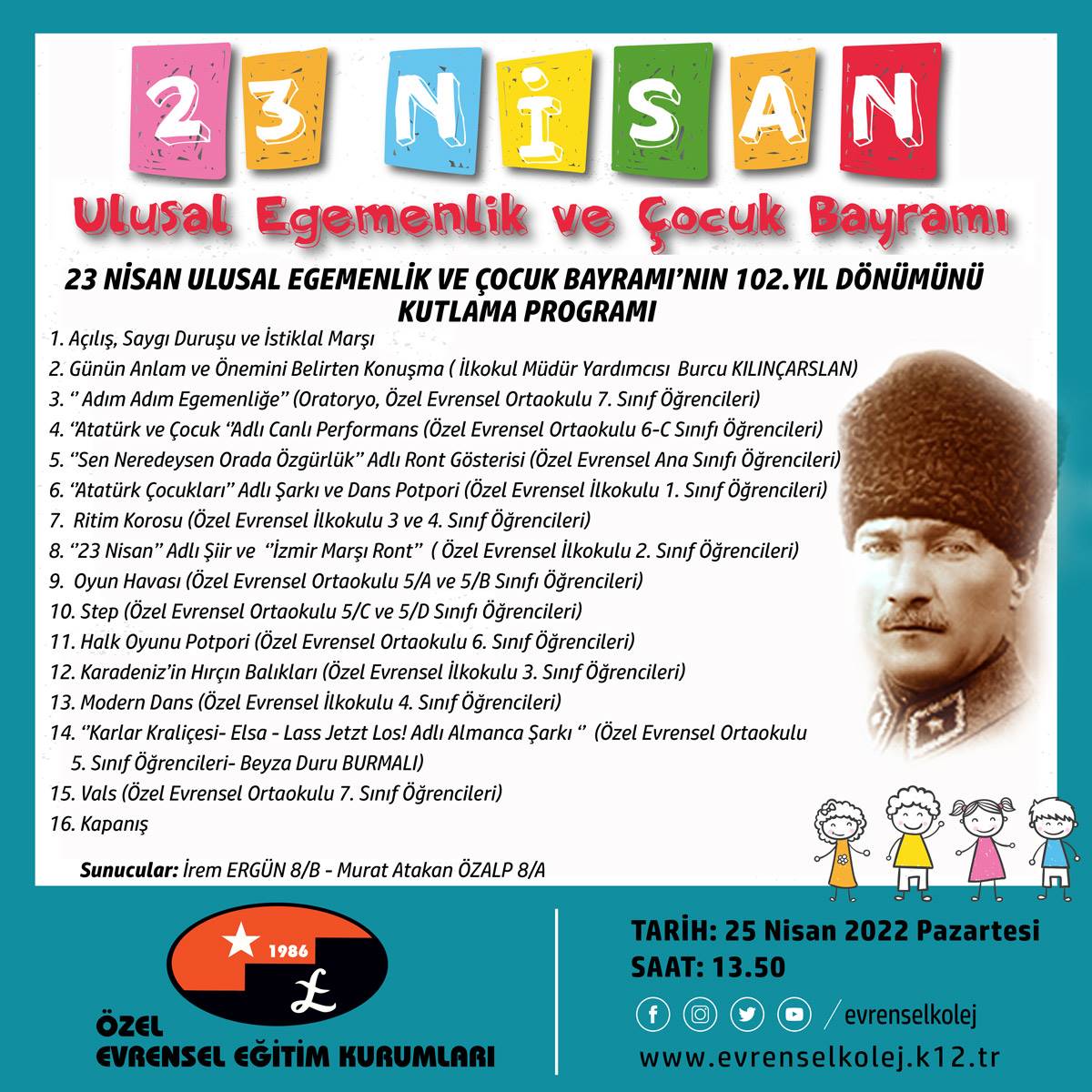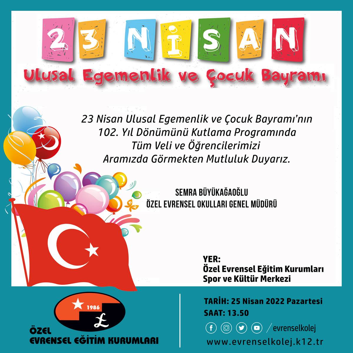 23 Nisan Ulusal Egemenlik ve Çocuk Bayramı’nın 102. Yıl Dönümünü Kutlama Programında Tüm Veli ve Öğrencilerimizi Aramızda Görmekten Mutluluk Duyarız.