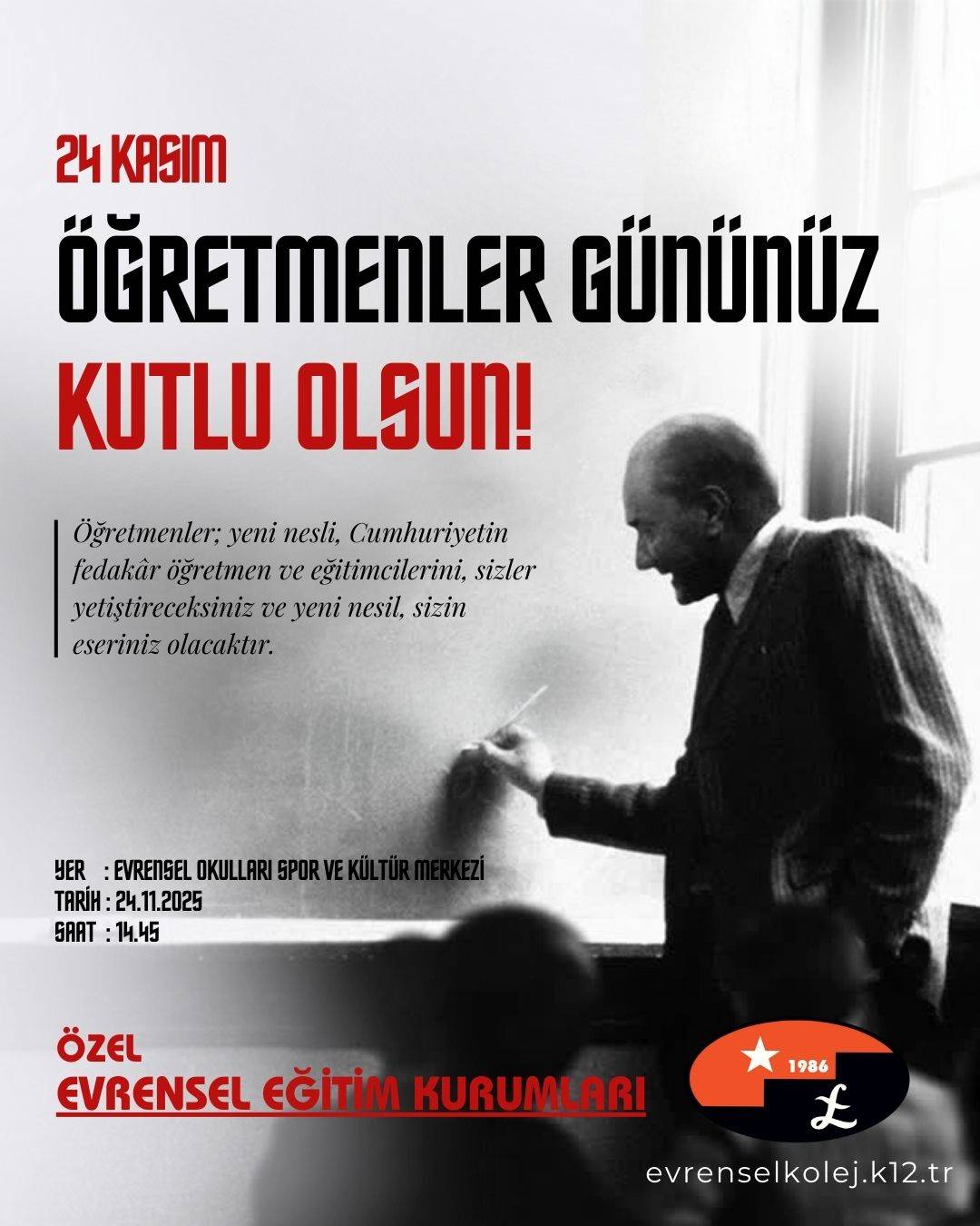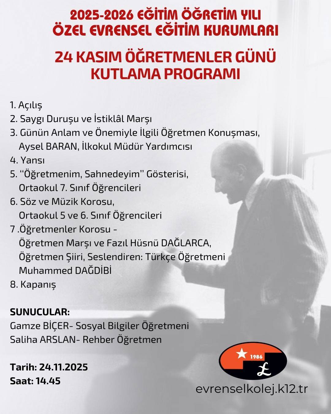24 Kas 2025 24 KASIM ÖĞRETMENLER GÜNÜ KUTLAMA PROGRAMINA DAVETLİSİNİZ 24 Kasım Öğretmenler Günü Töreninde sizlerle birlikte olmaktan kıvanç duyarız. Paylaş: