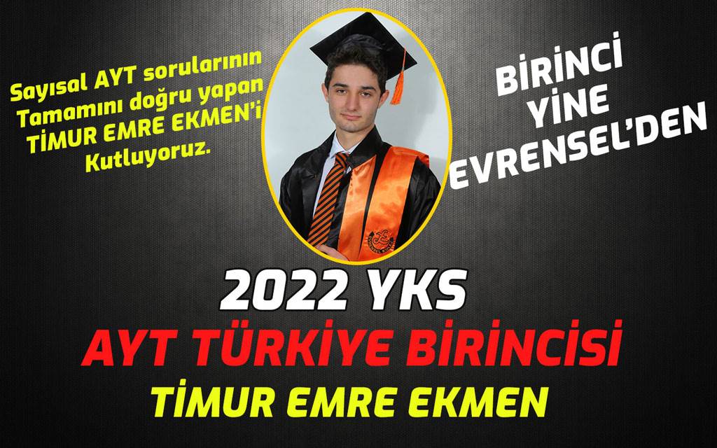 AYT Sayısal sorularının tamamını doğru yapan Özel Evrensel Kolej öğrencisi Timur Emre EKMEN, AYT 2022 TÜRKİYE BİRİNCİSİ.