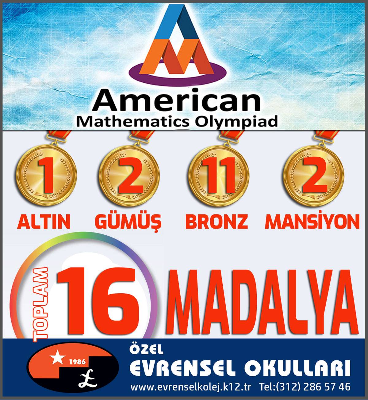 Dünyadan birçok ülkenin katıldığı bu yarışmada, EVRENSEL KOLEJ öğrencileri 1 ALTIN, 2 GÜMÜŞ, 11 BRONZ ve 2 MANSİYON ile TOPLAM 16 MADALYA kazanarak büyük bir başarıya imza attılar. Ayrıca Öğrencimiz Ahmet Erhan AVCI, ALTIN madalya kazanan öğrenciler arasında EN YÜKSEK puan sıralamasına göre Dünya 6.sı, Türkiye 1. si olarak okulumuz gururu oldu.