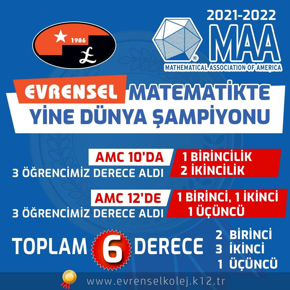 Uluslararası Matematik Yarışması (International American Math Olympiads) bu yıl 10.sınıflar için 29 Ekim 2021, 12.sınıflar için ise 10-16 Kasım 2022 tarihlerinde yüz yüze olarak gerçekleştirildi. Lise kategorisinde iki farklı seviye bulunan AMC’ de 10.sınıf ve alt sınıf öğrencileri için AMC 10 yarışması, 12. sınıf ve alt sınıf öğrencileri için AMC 12 yarışması uygulanmaktadır. AMC 10 ve AMC 12 yarışmaları 75 er dakikalık ve her biri 25 sorudan çoktan seçmeli sınavlardır. Bir öğrenci verilen her bir doğru cevap için 6 puan ve boş bırakılan her bir soru için 1.5 puan almaktadır. Yanlış cevaplara ise puan verilmemektedir. AMC 12 öğrencilerinden ulusal sıralamada ilk 5% e girenler (veya en az 100 puan alanlar) American Invitational Mathematics Examination ( AIME)’ a katılmaya hak kazanmaktadır. AMC 10 öğrencilerinden ise ulusal sıralamada ilk 1% e girenler (veya en az 120 puan alanlar) AIME' e katılmaya hak kazanırlar.