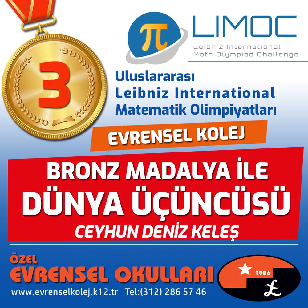 Yarışmaya Evrensel Fen Lisesi’nden Ali Doğan ÇAMUR ve Ceyhun Deniz KELEŞ adlı öğrencilerimiz Matematik alanında katıldılar. Yarışmada öğrencimiz Ceyhun Deniz KELEŞ, BRONZ madalya kazanarak büyük bir başarıya imza atarak okulumuza ve ülkemize büyük bir gurur yaşattı.