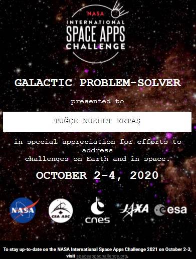 NASA tarafından 9 yıldır düzenlenen Space Apps Challenge’e (NASA’nın araştırmayı yetenekle birleştiren beyinlere ulaşmak için düzenlediği küresel bir HACKATHON. Dünya çevre problemlerinin çözülmesi, uzay teknolojilerinde ilerleme kaydedilmesi ve insanlığın geliştirilmesi için yeni fikirler bulmak üzerine uygulamalar ve platformlar oluşturan organizasyon) öğrencimiz Tuğçe Nukhet ERTAŞ Sustaining Our Planet for Future Generations alanında başvurarak okulumuzu temsil etmiştir. Öğrencimiz 150 ülkeden 26000 katılımcının 2300 proje ile katıldığı yarışmada "Sustaining Our Planet for Future Generations" kategorisinde KATILIM sertifikası almaya hak kazanarak projemiz ve okulumuz NASA’nın Space Apps Challenge 2020 internet sitesinde yayınlanmıştır.