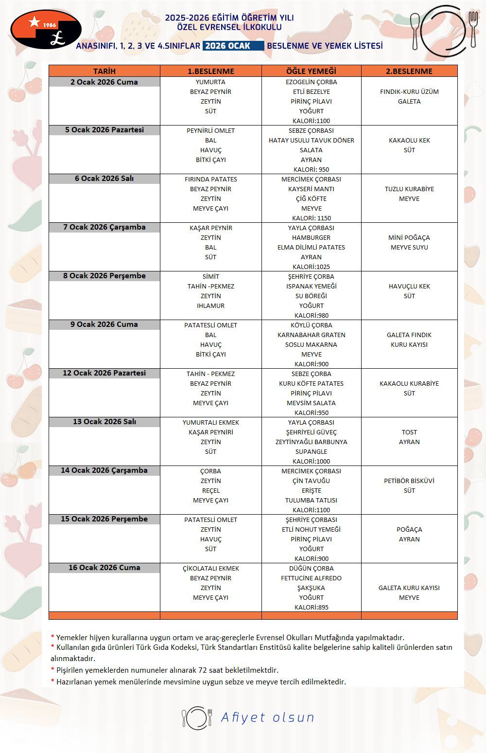 ÖZEL EVRENSEL OKULLARI OCAK 2026 YEMEK LİSTESİ
